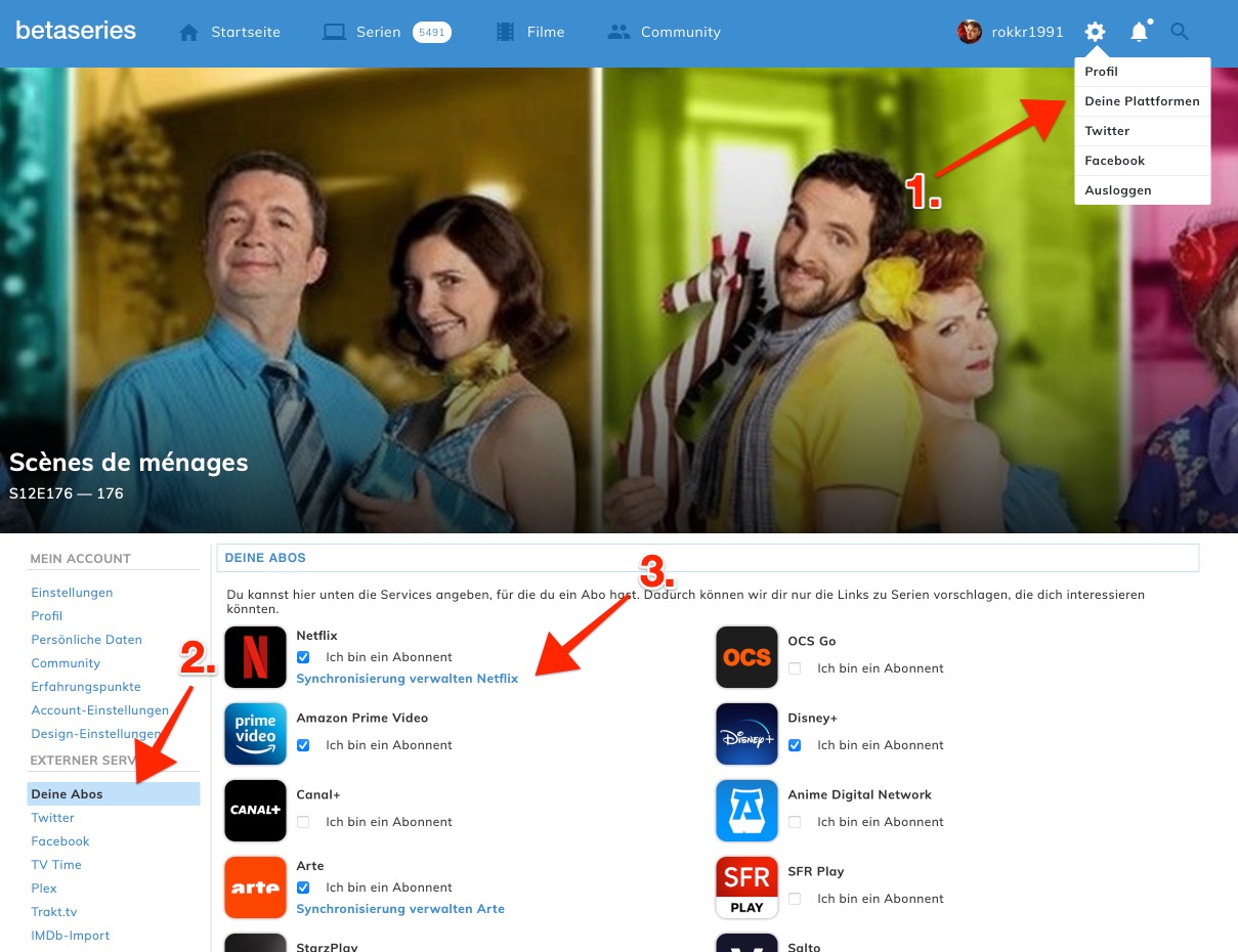 Gehe in der Menüleiste auf das Zahnrad und anschließend auf „Deine Plattformen“ oder in den Einstellungen auf „Deine Abos“ und dort bei Netflix auf „Synchronisierung verwalten: Netflix“.
