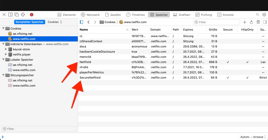Klicke dich ein bisschen rum und suche nach „Cookies“. Bei Safari findest du diese im Menüpunkt „Speicher“, bei Chrome unter „Application“. Auf der linken Seite öffnest du dann „Cookies“ und „www.netflix.com“, und schon hast du die Informationen, die du benötigst.