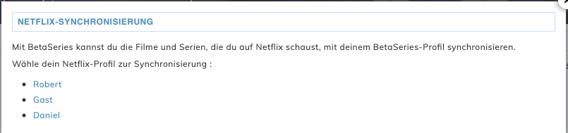 Hast du die Felder korrekt ausgefüllt, musst du im nächsten Schritt dein Profil auswählen, welches du mit BetaSeries synchronisieren willst. Die Synchronisierung startet automatisch und wird je nach deinem Netflix-Konsum alle 4 bis 24 Stunden dein Profil auf neu angeschaute Serien und Filme überprüfen. Diese werden dann auch auf BetaSeries als angesehen markiert oder zu deinem Profil hinzugefügt.