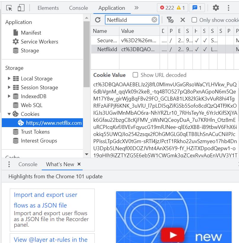 A continuación, se abrirá una consola. Haz clic en la pestaña de “Aplicación”. Si no la encuentras, haz clic en el icono “>>” y se desplegará una lista de opciones entre las que tendría que estar. A continuación, busca “Cookies” en la columna de la izquierda y despliega el submenú “https://www.netflix.com”. Introduce en el buscador “NetflixId” y aparecerán las dos cookies que necesitarás para sincronizar las cuentas. Cópialas haciendo doble clic en Chrome y Firefox y haciendo clic con el botón derecho y dándole a copiar en Safari.