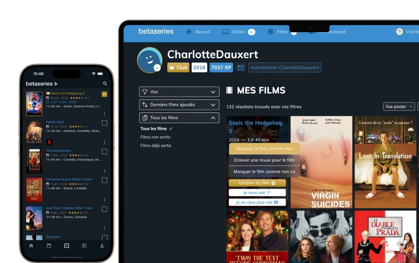 Dès maintenant, lorsque vous consultez la fiche d’un film que vous avez déjà vu ou depuis l’onglet “Films à regarder”, vous pouvez enregistrer un nouveau visionnage grâce à l’option “marquer le film comme revu” accessible directement en cliquant sur le bouton “Vu”. Que vous soyez sur mobile ou sur desktop, quelques clics suffisent pour enregistrer un rewatch.