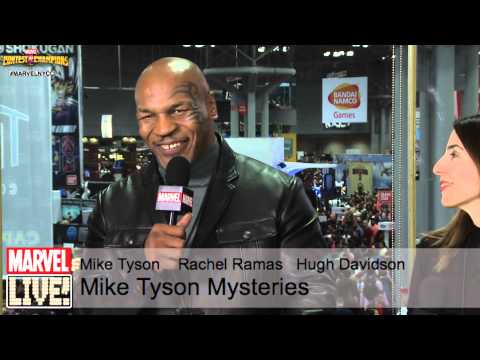 Mike Tyson. Rachel Ramas, and Hugh Davidson from Mike Tyson Mysteries stops by Marvel LIVE! and interacts with some of the convention goers on the floor at New York Comic Con 2014.