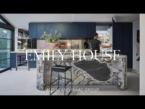 Located in the inner west of Sydney, Emily House strikes an unassuming appearance with dark tones, leafy greens and a timber batten façade that hints at what is inside the modern dream home. Following the house tour inside, the front of the home contains the master bedroom and ensuite before offering a glimpse of the opulent kitchen – which is designed to be the hub for connection. While using marble, granite and terrazzo throughout the modern dream home to add an opulence, the elements of curved bamboo, which is seen in the bathrooms and on the kitchen island bench, is used to soften the hardness of these materials.