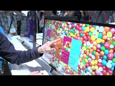 The SC77 Touch from Samsung should help with the ergonomics of using a touch screen on the desktop. It's multi-touch and it folds down to an angle where it won't be as fatiguing to use as a completely upright monitor.