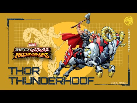 What has two giant horns, four hooves of steel, and carries Thor into battle like a battering ram? It's Thor's mighty new Mechasaur, Thunderhoof!