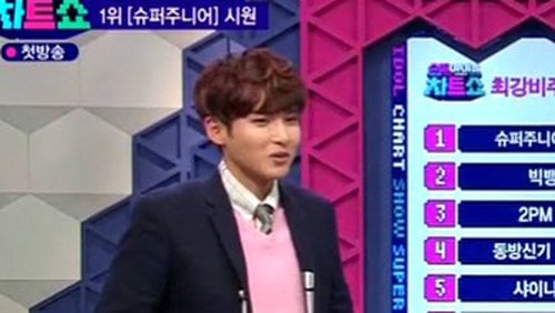 Super Idol Chart Show is a program hosted by Super Junior's Ryeowook and B2ST's Son Dongwoon. The 2 MCs must guess the ranking of the idols based on a question asked to the audience.