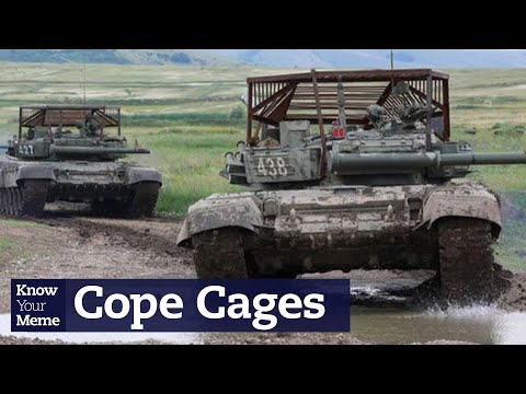 Cope Cages refers to a slang term for slat armor, also known as an RPG cage, made for Russian T-90 tanks and other vehicles in the 2021-2022 Russia-Ukraine conflict. Though slat armor is used by many armed forces for a variety of military vehicles all around the world, the term "cope cages" became the subject of memes in early 2022 to make fun of the Russian military and its efforts to overtake Ukraine, mostly due to their ineffectiveness against weaponry used by Ukrainian troops such as the Javelin missile. The nickname is also in reference to the Wage Cage and Copium memes.