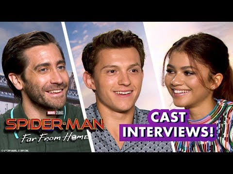 Ryan Penagos, a.k.a. Agent M, talks with the cast of Spider-man: Far From Home, including Tom Holland (Peter Parker / Spider-Man), Zendaya (MJ), Jake Gyllenhaal (Quentin Beck / Mysterio), Samuel L. Jackson (Nick Fury), and Jacob Batalon (Ned).