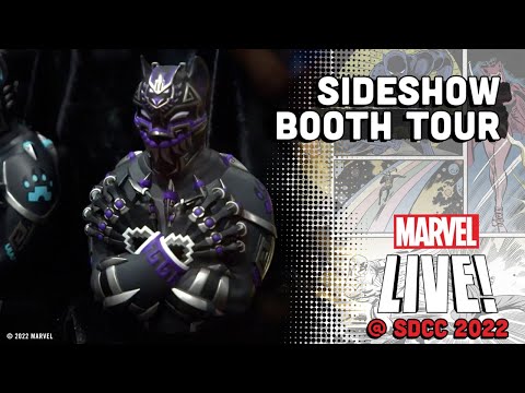 A behind the scenes look at Sideshow's booth at San Diego Comic-Con 2022, featuring incredible Marvel figurines like Thor, Wolverine, and Black Panther!