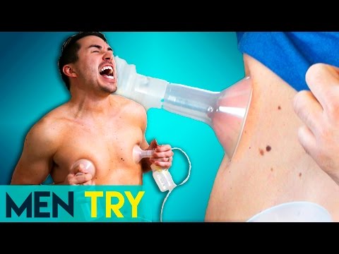 Today two men try breast pumps. We try a manual breast pump and a breast pump machine on an orange, cheek, forehead, nipples, and even their lips! Breast pumping is no joke! Free the nip!