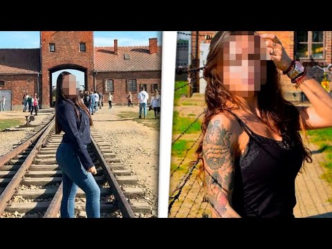 CHICA POSA DE FORMA FRÍVOLA JUSTO DELANTE DE UN CAMPO DE CONCENTRACÍON NAZI...