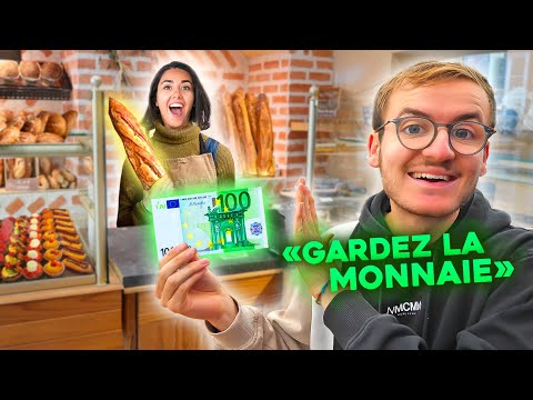 Aujourd'hui nouveau contenu à caractère vidéoludique pour le FC Lucas Studio : Payer des trucs pas chers qu’avec des billets de 100€ (en laissant la monnaie). Pendant 24h je vais acheter plein d'objets du quotidien mais uniquement avec des billets de 100 euros et en laissant toujours la monnaie aux vendeurs. Par exemple je vais acheter une baguette de pain qui coûte 0,80€ avec un billet de 100, sans demander la monnaie ! Le but c'est de voir la réaction des vendeurs, est-ce qu'ils l'acceptent ou qu'ils essayent de me rendre la monnaie ?