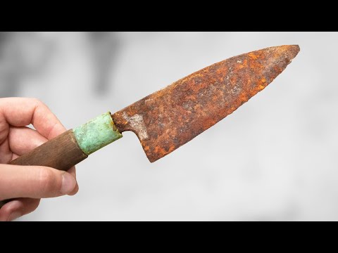 I in this episode I will restore a Japanese kitchen knife with a lot of rust. Rust has eaten a lot of the steel away. Also the handle was not in good shape and the wood had split. I started by removing the handle. I used block of wood to hammer it off the knife.